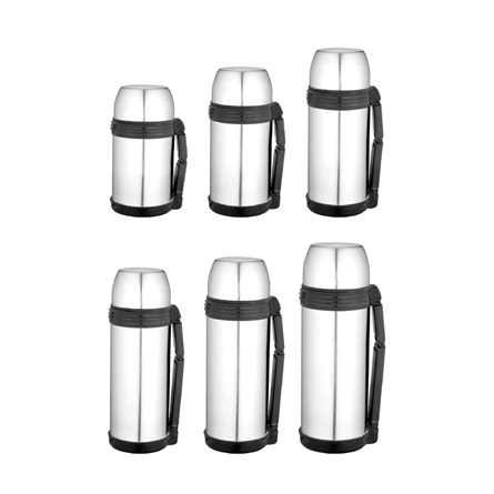 Double wall stainless steel insulated travel pot with extra plastic cup and convenient folding handle for easy portability. 600ml/800ml/1000ml/1200ml/1500ml/1800ml